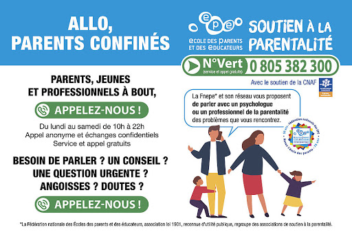 Pour faire face aux conséquences familiales du confinement, la Fédération nationale des Écoles des parents et des éducateurs avec le soutien de la CNAF met en service un numéro national d’appel gratuit en lien avec les membres de son réseau sur le terrain, les EPE, qui permet aux parents, aux jeunes et aux professionnels, d’échanger avec des psychologues et des professionnels de l’accompagnement parental : ALLO, PARENTS CONFINÉS